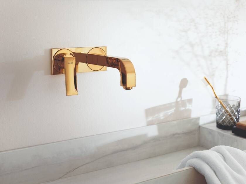 带“漂浮”式一字把手的雅生奇特里奥墙出式龙头可搭配雅生 FinishPlus 特殊表面(多达 15 种选择),包括抛光金色外观。