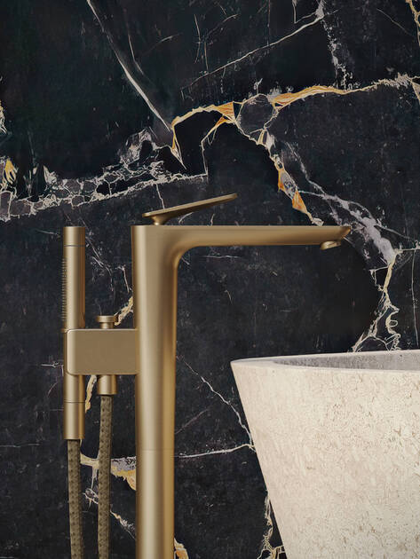 与面盆龙头一样,浴缸龙头也有多种外形和尺寸。提供的产品包括落地式浴缸龙头、带 sBox 的三孔翻边安装浴缸龙头和带花洒支架的墙面安装三孔浴缸龙头。