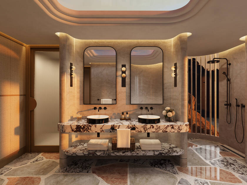 在 Tara Bernerd 的这一浴室构想中,标志性而又多元化的雅生 One 系列居于核心地位。其融合了简洁的直线与优雅的曲线的纤薄设计,为这间坐落于卡普里岛悬崖之上、以休憩为设计理念的浴室提供了理想的出发点。
