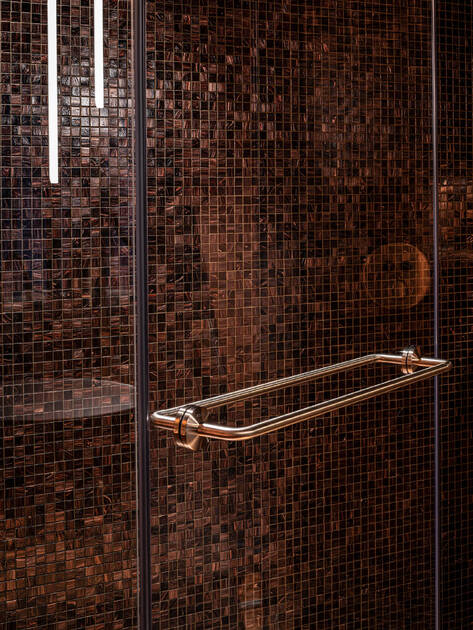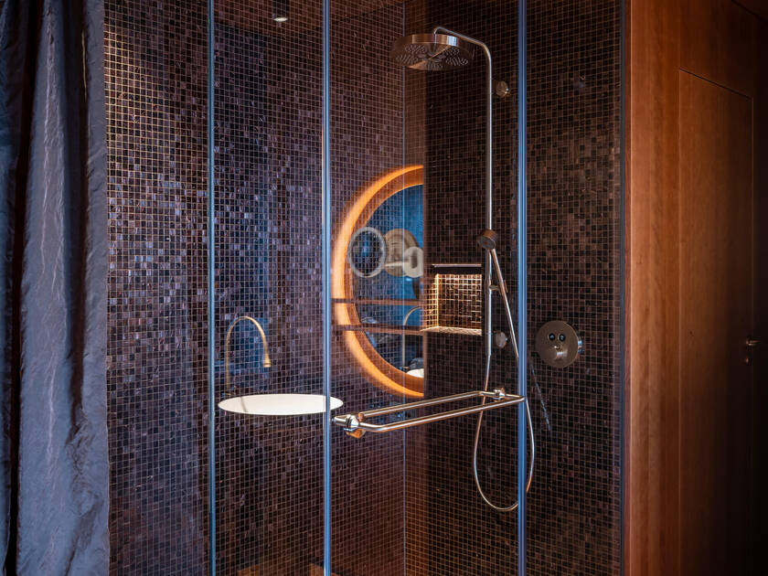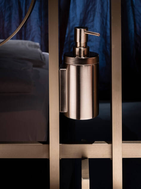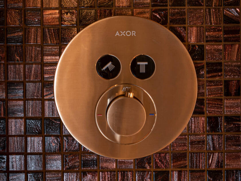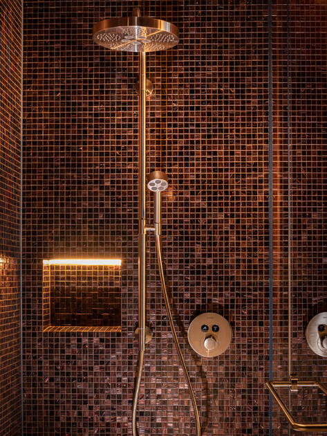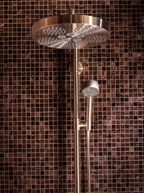 在每间套房中,水都扮演着主角:无论是露台上的浴缸、如诗如画的湖景,还是浴室中的 AXOR One系列。AXOR One 头顶花洒 280 2 速的特色是花洒盘上醒目的图形设计。该花洒还具有雨淋式和沄雨出水模式,用水量少,同时让用户沉浸在奢华的体验之中。雅生通用配件则采用了拉丝青铜色饰面,其通用外形也与 AXOR One 产品相得益彰。