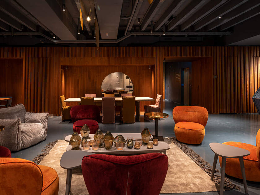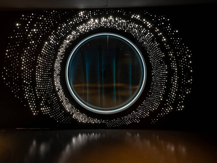 酒店的灯光与空间设计,邀请宾客步入探索之旅。A6 Architekten AG 的建筑师和项目管理团队共同开发了由木板条组成的垂直式外立面,让人不禁联想到芦苇荡。而在酒店内部,宽敞的大厅意蕴温暖氛围,化身奇幻之旅的起点。作为酒店的枢纽,大厅将新建筑与现有建筑的结构连接起来。在视觉上,入口区最显眼的特点首先是原始的釉面混凝土天花板和似乎漂浮于其下方的金色圆盘。它们由酒店的旧灯具改造而成,令其他天体与“太阳”相映成趣。