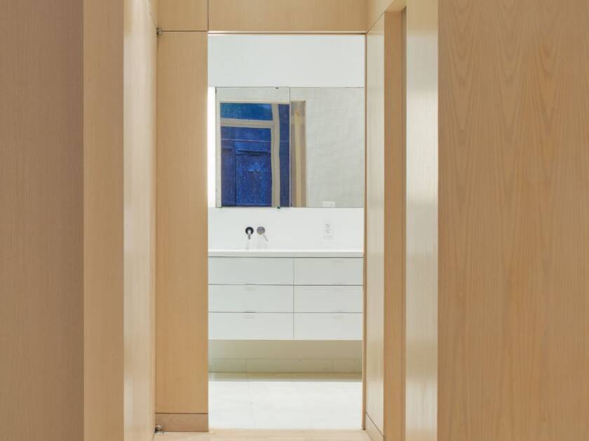 建筑师的其中一个出色构想就是每户公寓的卧室和客厅之间的“第三空间”。高度不到 1.2 m,配备了日式被褥、座椅、厨房上方的草本花园以及直接与楼下的主淋浴间相连、栽有蕨类植物的玻璃草本花园。这些“第三空间”下方是一个分区式立方体起居区,包括有存储空间和浴室。生长灯作为光源为蕨类植物提供了日光的照明,而淋浴间的水蒸汽可以通过玻璃收集起来用于浇灌植物。这些仅仅是 Stealth Building 践行简约奢华原则的众多生活细节中的一小部分。