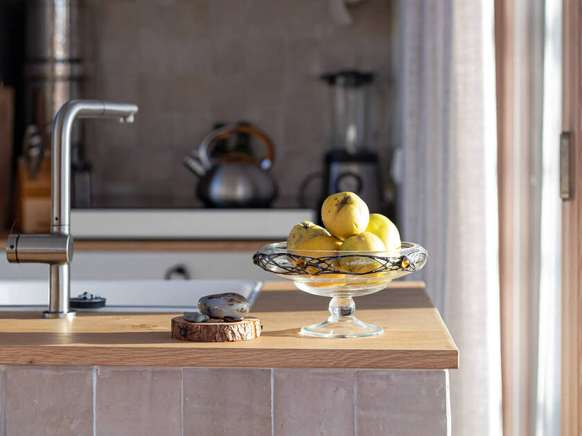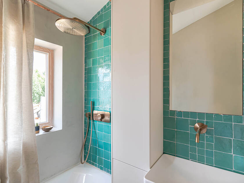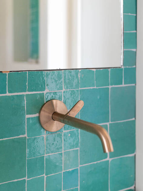 浴室融合了简约化设计和阿拉伯风情,化身为静谧而明亮的沐浴空间与休憩之所。地砖洋溢着土耳其浴室的风格,而手工制作的摩洛哥墙砖则以绿松石色为台盆区域增添活力与生机。为了与浴室的冷色调和自然氛围和谐匹配,雅生 One 系列的龙头和棒式手持花洒采用拉丝古铜色——雅生 FinishPlus 饰面之一。龙头以其简约而隽永的造型完美展现迷你小屋的极简主义精神。