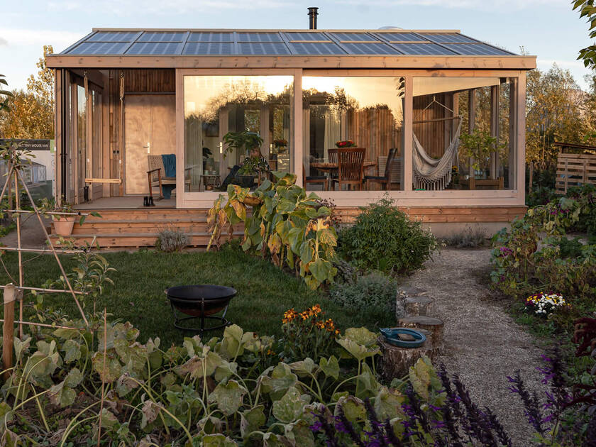 迷你小屋的各个方面都经过精心设计,包括采用生长迅速的可持续来源木材作为建筑材料,以求尽量减少生态干预,深化人与自然的联系。这座住宅完全依靠太阳能供电,可储存并回收利用多达 4500 升雨水,用来冲洗马桶和洗涤衣物。在室外区域,Marjolein 打理自给自足的有机园圃,种植各类花草和果蔬植物,因而还吸引了本地鸟类和各种昆虫。